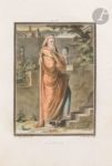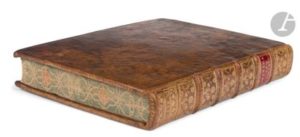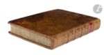 [LEVACHER DE CHARNOIS (Jean-Charles)]. Recherches sur les costumes et sur les théâtres de toutes les nations, tant anciennes que modernes ; Ouvrage utile aux Peintres, Statuaires, Architectes, Décorateurs, Comédiens, Costumiers, en un mot aux Artistes de tous les genres ; non moins utile pour l’étude de l’Histoire des temps reculés, des Mœurs des Peuples antiques, de leurs Usages, de leurs Loix, et nécessaire à l’Éducation des Adolescens. Paris : M. Drouhin, 1790. —2 tomes en un volume in-4, 249 x 192 : frontispice, (1 f.), 8, 150 pp., (1 f.), 29 planches, 1 carte ; (1 f.), 175 pp., (1 p.), pp. 176-183, 24 planches. Basane marbrée, dos à nerfs orné, tranches peintes d’un décor d’entrelacs blancs sur fond bleu enserrant des cocardes rondes rouges et blanches (reliure de l’époque). Colas, 717. Édition originale de ce remarquable ouvrage, resté inachevé, offrant une étude approfondie sur le costume ancien au théâtre, l’auteur s’appuyant essentiellement sur les personnages des tragédies de Jean Racine. Journaliste, critique littéraire, et dramaturge, Jean-Charles Levacher de Charnois (1749-1792) fut un familier du monde du théâtre. Il collabora au Journal des théâtres et publia notamment un ambitieux ouvrage intitulé Costumes et Annales des grands théâtres, commencé en 1786 mais abandonné en 1789. Ces Recherches en sont le complément. L’illustration comprend un frontispice et 53 planches, la plupart en couleurs et au lavis, gravées par Pierre-Michel Alix, Ridé et Sergent d’après les dessins de Philippe Cléry. Parmi ces planches figure une carte de l’Épire. Très bel exemplaire en reliure de l’époque, présentant des tranches peintes. Il est complet des 8 pages comprenant des Observations préliminaires, que les bibliographes ne mentionnent pas. Trace brune sur le second plat. La peinture sur la gouttière est en partie effacée. Provenance : Dubuisson, avec son nom doré en bas du dos.