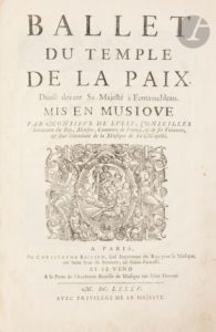 LULLY (Jean-Baptiste). Ballet du temple de la paix. Dansé devant Sa Majesté à Fontainebleau. Paris : Christophe Ballard, 1685. — In-folio, 368 x 245 : (2 ff.), 216 pp. Basane brune, dos à nerfs orné, tranches mouchetées (reliure de l’époque). Édition originale rare, dédiée à Louis XIV, de la partition complète de ce ballet de Jean-Baptiste Lully, représenté pour la première fois à Fontainebleau en 10 octobre 1685, sur un livret de Philippe Quinault, pour célébrer la trêve de Ratisbonne du 15 août 1684 et la fin de la guerre des Réunions (1683-1684), menée par la France contre le Saint-Empire romain germanique et l’Espagne. Bon exemplaire en reliure de l’époque, bien complet du paraphe de contrôle de Lully sur la dernière page. Nombreuses épidermures sur les plats, manques aux coiffes, les gardes ont été retirées. Mouillures claires, plus prononcées au cahier L. Déchirure sans manque aux feuillets D2, G1 et O1.