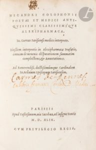 NICANDRE. Nicandri Colophonii poetæ et medici antiquissimi clarissimique Alexipharmaca. Jo. Gorræo Parisiensi medico interprete. Ejusdem interpretis in Alexipharmaca Præfatio, omnem de venenis disputationem summatim complectens, & Annotationes. Ad Reverendis. doctissimumque Cardinalem Jo. Bellaium Episcopum Parisiensem. Paris : Vascosan, 1549. — In-8, 170 x 112 : 70 ff., (2 ff. dernier blanc). Parchemin souple, marques de liens sur le bord des plats, dos lisse (reliure de l’époque). Édition originale de la traduction en vers latins par le médecin Jean de Gorris (1505-1577), de l’Alexipharmaques du médecin et poète grec Nicandre (0250 ?-0170 av. J.C.). Il s’agit d’un poème didactique consacré aux poisons, venins et substances toxiques. Composé de plus de 600 vers, il décrit les différents types de toxines, qu’elles soient animales ou végétales, ainsi que les antidotes et les pratiques thérapeutiques qui combinent des connaissances médicales, des croyances magiques et des remèdes naturels. L’édition est bilingue, grec-français, et comprend de nombreux commentaires du traducteur. Elle débute par une longue préface de ce dernier, dédiée au cardinal Jean Du Bellay. Remarquable impression du célèbre imprimeur Michel de Vascosan, gendre de l’imprimeur-libraire Josse Bade. Libraire juré de l’université de Paris à partir de 1528, il deviendra imprimeur du roi en 1561. Bel exemplaire provenant de la bibliothèque des Carmes de Rennes, donné à cette institution par le médecin rennais François Cardose. Les ex-libris de ces deux provenances figurent sur le titre. Au moins un autre ouvrage avec ces mêmes provenances se trouve à la bibliothèque de Rennes Métropole. Salissures et quelques taches à la reliure, trois petits trous au dos. Manque les liens. Quelques notes manuscrites dans les marges de la préface. Provenance : François Cardose, avec ex-libris manuscrit « Francisci Cardosii R. Medici » (XVIIe siècle ?). - Carmes de Rennes, avec ex-libris manuscrit. - Monogramme non identifié en haut du titre et cote manuscrite « 1708 Y. 440 » en regard de celui-ci, laquelle cote est reprise à l’encre au bas du dos.