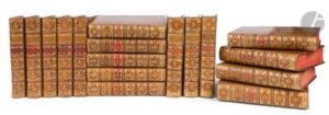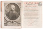 PRÉVOST (Antoine François). Histoire générale des voyages, ou collection de toutes les relations de voyages par mer et par terre, Qui ont été publiées jusqu’à présent dans les différentes Langues de toutes les Nations connues… Paris : Didot, 1746-1749 [tomes 1 à 7] — Paris : Didot ; Lausanne, Marc-Michel Bousquet, 1750-1759 [tome 8] — Paris : Didot, 1751 [tomes 9 à 15]. Table alphabétique des matières contenues dans les XV volumes de l’histoire générale des voyages. Paris : veuve Didot, 1761 [tome 16]. Suite de l’histoire générale des voyages… Amsterdam : Arkstée et Merkus, 1761 [tome 17]. — 17 volumes in-4 (sur 20), 253 x 194. Veau marbré, dos à nerfs orné, tranches rouges (reliures de l’époque). Édition originale de la première grande compilation de relations de voyages, entreprise par l’abbé Prévost. Il s’agissait dans un premier temps de la traduction française de l’ambitieuse publication que John Green avait commencé à faire paraître en Angleterre en 1745 sous le titre A new general collection of voyages and travels. Pour Green le but de cet ouvrage était « 1° d’empêcher la perte d’un grand nombre de livres précieux ; 2° de rendre commun des livres rares ; 3° de former un corps des meilleurs auteurs qui ont écrit sur les différentes parties du monde » (p. i). L’abbé Prévost ne se contenta cependant pas d’une simple traduction et se permit quelques suppressions ; il fit également graver de nouvelles planches et cartes. Le succès de l’édition anglaise n’ayant pas été au rendez-vous, Prévost dû continuer l’aventure seul à partir du volume 8. Exemplaire formé des 17 premiers volumes, il ne manque que les 3 derniers parus entre 1768 et 1789 comprenant la Continuation de l’histoire générale des voyages. Les 15 premiers ont été publiés par l’abbé Prévost, le 16e contient la table générale et le dernier constitue la première suite. Il parut en parallèle une édition in-12 en 80 volumes. L’illustration comprend au total 529 planches sur 531, à savoir un portrait de l’auteur gravé par Schmidt, plus de 200 cartes et plans ainsi que plus de 300 figures gravées d’après les dessins de Cochin fils, Chedel, Tardieu fils, etc. Les planches XII et XV du quatrième volume sont comme toujours dans le cinquième. Il manque, comme souvent, la mappemonde annoncée dans le tome 6 mais qui devrait figurer en tête du tome 1, comme indiqué dans l’avis au relieur, et la planche XXXV (Airs chinois) dans le tome 6. Très bel exemplaire en reliures de l’époque. Les dos présentent quelques légères différences dans les décors. Habiles et discrètes restaurations aux reliures. Manque à quelques coiffes, quelques rares travaux de vers. Quelques rousseurs éparses et de rares mouillures sans gravité.