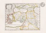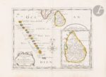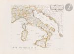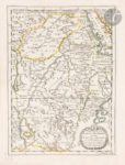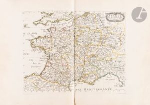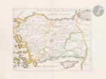 SANSON, N. L’Asie / L’Afrique / En Plusieurs Cartes Nouvelles. . . / L’Europe dédiée à monseigneur le Tellier. Paris, l’Autheur, 1652-1656. — Trois volumes petit in-4. Vélin de l’époque. Reliures usagées. Petit cachet rectangulaire illisible affectant les feuillets blancs ainsi que certaines cartes dans l’angle inf. droit. Manque important de vélin au premier plat de l’Asie, mouillures en fin de volume en partie inf., cachet illisible dans l’angle inf. droit de la carte d’Arabie. Afrique : taches brunes affectant la carte de Barbarie, cachet illisible dans l’angle inf. droit de la carte, quelques mouillures marginales dans le texte. Ensemble de 3 volumes sur 4 en édition originale des atlas de Sanson comprenant l’Asie (17 cartes), l’Afrique (18 cartes) et l’Europe (12 cartes), dont les cartes ont été finement coloriées aux limites à l’époque. Celles-ci sont accompagnées de feuillets de texte explicatif. L’atlas de l’Asie comprend d’importantes cartes du Japon et des Philippines ainsi qu’une carte de l’Arabie représentant Bahreïn orthographié « Baharem ». Comme Sanson a été le premier cartographe français à avoir accès aux relevés des Jésuites qui venaient d’arriver de Chine, son travail apporte des informations inédites. Les premiers atlas publiés par Sanson, un pionnier dans la production d’atlas et dans le fait de faire de la cartographie une science, étaient des atlas in-4 des continents. La plupart des cartes sont gravées spécialement pour ces ouvrages et ne sont pas des réductions de cartes plus grandes déjà publiées. Il édita seul les atlas in-quarto des quatre continents. Ces atlas furent largement répandus grâce aux éditions étrangères dont ils firent l’objet et qui regroupèrent les quatre ouvrages sous le titre général de « Description de tout l’univers ». Pastoureau, Les atlas français XVIe-XVIIe siècles, Sanson III A.