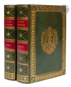 BURGSDORF (Friedrich August Ludwig von). Nouveau manuel forestier, à l’usage des agens forestiers de tous grades, des Arpenteurs, des Gardes des Bois Impériaux et Communaux, des Préposés de la Marine pour la recherche des Bois propres aux Constructions Navales ; des Propriétaires et des Marchands de Bois, et de tous ceux qui s’occupent de la Culture du Bois et de son Emploi dans les Arts économiques. Paris : Arthus-Bertrand, 1808. — 2 volumes in-8, 203 x 131 : lij, 445 pp., pp. 449-460, 2 tableaux ; (2 ff.), 579 pp., 29 planches, 3 tableaux. Veau vert, encadrement d’une large roulette aux palmettes dorées entre deux doubles filets dorés, et armes impériales dorées au centre sur les plats, dos lisse orné, tête dorée, non rogné (reliure moderne à l’imitation). Édition originale de la traduction française faite par l’agronome Jacques-Joseph Baudrillart sur la quatrième édition allemande, adaptée au système d’administration de la France et publiée sous les auspices de Joseph-Alexandre Bergon, directeur général des forêts. Ce traité est l’œuvre de Frédéric Auguste Louis de Burgsdorf (1747-1802), grand maître des forêts de la Prusse, professeur public de la science forestière et membre de l’Académie des sciences de Berlin. En commandant cette traduction, Bergon avait pour objectif « d’introduire la science allemande de la forêt dans l’approche de la gestion française de son espace forestier » (Daniel Perron, La Forêt française : Une histoire politique, 2021). Le premier volume débute par une introduction sur la « Nécessité d’exiger des connaissances fondamentales de la part de ceux qui doivent occuper des emplois forestiers », suivie de deux sections : « aperçu de la physique en général » et « Histoire naturelle des forêts ». Le second volume porte sur les « Connaissances de mathématiques nécessaires dans les forêts, et de leur application dans la pratique » (géométrie, mécanique, constructions maritimes, constructions civiles, etc.) ainsi que sur l’entretien et l’amélioration des forêts avec notamment des chapitres sur la chasse, la pêche et les délits forestiers. L’édition comprend 5 tableaux hors texte dont un au format grand aigle donnant les listes des arbres et arbustes forestiers, et 29 planches. Très bel exemplaire en reliure pastiche, à l’imitation d’une reliure impériale, réalisée par Marc Ollivier. Quelques rousseurs éparses. Provenance : Dupeyroux, avec signatures autographes.