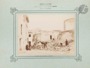 [FOUQUET (Ferdinand)]. Andalousie. Tremblements de terre 1884-85. Mission française. S.l., vers 1885. — Album in-4, 303 x 250. Demi-chagrin vert foncé, dos à nerfs orné (reliure de l’époque). Album très rare de 72 photographies originales prises lors de la mission française envoyée par l’Académie des sciences en Andalousie après les tremblements de terre qui touchèrent cette région à la fin de l’année 1884. Cette expédition fut dirigée par Ferdinand Fouquet (1828-1904), volcanologue, géologue, pétrographe, docteur en médecine (1858), professeur de géologie au Collège de France, membre de la Commission de la carte géologique détaillée de France, membre de l’Institut, Académie des sciences, section de minéralogie (élu en 1881) et président de l’Académie des sciences (en 1901). Ces photographies, de 167 x 110 mm, sur papier albuminé collé sur carton bleuté avec encadrement en noir, sont montées sur onglet. Chaque épreuve comprend en tête un cachet indiquant : « Andalousie. Tremblements de terre 1883-85. Mission Française », et toutes, sauf quatre, ont été légendées à la main à l’époque. Cet ensemble est rarissime et peut-être unique. Un exemplaire numérisé sur Gallica, conservé à la Bibliothèque Nationale de France et provenant d’un don direct de Fouquet fait en 1886, présenté de la même manière que celui-ci, ne comprend que 20 photographies qui figurent bien dans cet exemplaire. Importants frottements au dos, accroc à la coiffe de tête, fente aux mors, plats décolorés.