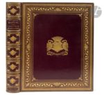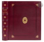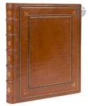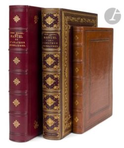 GRUEL (Léon). Manuel historique et bibliographique de l’amateur de reliures. Paris : Gruel & Engelmann, 1887 ; Paris : Léon Gruel, Henri Leclerc, 1905. — 2 volumes in-4, 294 x 234 et 298 x 240 : (2 ff.), 186 pp., (1 f.), 68 planches ; frontispice, (2 ff.), 186 pp., (1 f.), 71 planches, couverture illustrée. Maroquin bleu foncé, encadrement de roulettes et de filets dorés sur les plats, armes dorées au centre du premier plat, dos à nerfs orné, roulettes et filets dorés en encadrement à l’intérieur, doubles gardes, tranches dorées (volume 1) ; chagrin bordeaux, filets à froid en encadrement et fers dorés aux angles et au centre sur les plats, dos à nerfs orné, roulette dorée intérieure, tête dorée, non rogné, couverture conservée (volume 2) (Birdsall & son à Northampton (vol. 1) - Marc Ollivers (vol. 2)). Édition originale de cet ouvrage de référence sur les reliures. Les deux volumes parurent à plus de vingt ans d’intervalle. Le premier fut tiré à 1000 exemplaires et le second à 700. Chacun est illustré de nombreuses reproductions dans le texte et hors texte. Un des 700 exemplaires sur beau papier vélin de Rives pour le premier volume et un des 600 sur le même papier pour le second. Superbes exemplaires. Le premier volume est en reliure anglaise de l’époque aux armes de l’homme politique et bibliophile anglais George Guy Greville, 4e comte de Warwick, 4e comte de Brooke (1818-1893). Le second volume est en reliure pastiche moderne de Marc Ollivier. Exemplaires très bien conservés. On joint : - La Reliure ancienne et moderne. Recueil de 116 planches de reliures artistiques des XVIe, XVIIe, XVIIIe et XIXe siècles ayant appartenu à Grolier, Henri II, François Ier, Diane de Poitiers, Marguerite de Valois, Louis XIII, Mazarin, etc., et exécutées par Le Gascon, Clovis et Nicolas Eve, Hardy Mennil, Bauzonnet, Belz-Niédrée, etc. Introduction par Gustave Brunet accompagnée d’une table explicative avec notice descriptive de 31 reliures des plus remarquables. Paris : Éd. Rouveyre et G. Blond, 1884. — In-4, 255 x 200. Veau havane orné sur les plats d’un décor à la Du Seuil composé de filets dorés, de bandes de maroquin brun et de motifs dorés aux angles, dos à nerfs orné, tête dorée, non rogné, couverture conservée (Marc Ollivier). Édition originale. Un des 800 exemplaires sur papier vergé, en très belle reliure pastiche réalisée à la manière d’une reliure du XVIe siècle par Marc Ollivier.