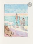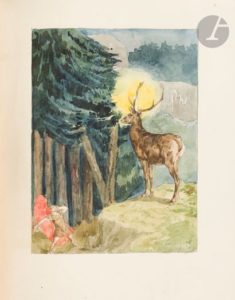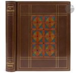 JACQUES DE VORAGINE - LUNOIS (Alexandre). La Légende dorée. Traduction française de H. Piazza. Paris : Librairie artistique G. Boudet, 1896. —In-4, 320 x 249 : (4 ff. 2 premiers blancs), 152 pp., (4 ff. 2 derniers blancs), couverture illustrée. Maroquin brun, plats ornés au centre d’un panneau composé d’un décor à répétition de feuillages mosaïqués de maroquins fauve, verts et bleus, bordé d’un large cadre de filets dorés s’entrecroisant aux angles, dos lisse orné, double filet doré en encadrement à l’intérieur, doublures et gardes de soie violette, doubles gardes, tranches dorées sur témoins, couverture et dos conservés, étui bordé (René Kieffer). Édition originale de la traduction faite par Henri Piazza de ce célèbre ouvrage de Jacques de Voragine. Il s’agit de l’une des plus brillantes éditions illustrées de ce texte parues au XIXe siècle, comprenant 78 lithographies en couleurs d’Alexandre LUNOIS (1863-1916), dont 4 culs-de-lampe, ainsi qu’un titre et 13 encadrements gravés sur bois par M. Thomas d’après les dessins du même artiste. Tirage à 200 exemplaires. Celui-ci est un exemplaire unique tiré sur papier de Chine, comprenant à la justification ce long envoi de Lunois au crayon : Mon cher... [nom du destinataire non inscrit ou soigneusement effacé] // Voici l’exemplaire que je vous avais promis // je l’ai choisi avec soin et toutes les épreuves ont été // vues par moi chez les imprimeurs aussi bien pour // le texte que pour les lithos, je ne crois pas // qu’il y en ait une qui ne soit pas très bonne. // Puisse ce livre vous faire plaisir. // Alex Lunois Ce précieux exemplaire a été relié de main de maître par René Kieffer et enrichi des pièces suivantes : - 6 AQUARELLES ORIGINALES SIGNÉES DE LUNOIS, pour les illustrations des pages 29, 31, 43, 83, 97 et 123, - suite en noir sur chine des lithographies et des encadrements, à l’exception des 4 culs-de-lampe, - 112 épreuves supplémentaires de la plupart des lithographies, dont 53 en couleurs sur différents japon, 2 en bistre sur japon, 18 en noir ou bistre sur chine et 38 en couleurs sur chine, - double couverture. Exemplaire parfaitement conservé. Provenance : Robert Beauvillain, avec ex-libris (vente 5 juin 2020, n° 345).