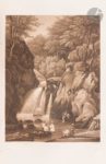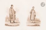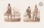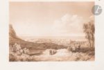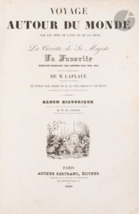LAPLACE (Cyrille Pierre Theodore). Voyage autour du monde par les mers de l’Inde et de la Chine de La Corvette de Sa Majesté La Favorite exécuté pendant les années 1830, 1831, 1832. Paris : Arthus Bertrand, 1835. — In-folio, 477 x 320 : (2 ff.), 72 planches. Demi-maroquin rouge, dos à nerfs orné (reliure de l’époque). Sabin, n°38985. Album historique seul, sans les volumes de texte ni celui de l’Atlas hydrographique, du récit du voyage autour du monde entrepris par l’explorateur Cyrille Pierre Théodore Laplace (1793-1875) de 1830 à 1834. Il comprend 72 planches en bistre gravées à l’aquatinte, d’après les dessins de Barthélémy Lauvergne (1805-1871), peintre, dessinateur et lithographe de la marine française, de Pâris, et de Louis Auguste de Sainson (1801-1887) sous la direction duquel l’édition fut faite. Le titre est illustré d’une vignette gravée sur bois par Porret d’après Sainson. Exemplaire enrichi d’un portrait sur chine appliqué avant la lettre, lithographié par Émile Lassalle, daté de 1840, dont le sujet n’a pas été identifié. Exemplaire en partie dérelié. Reliure très abîmée, comprenant de nombreux frottements d’usage, manque une partie du dernier caisson, fentes aux charnières. Gardes déreliées. Nombreuses rousseurs. Mouillure angulaire aux 15 premiers feuillets.