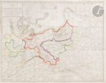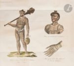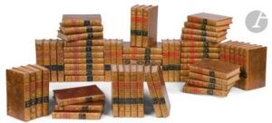 MALTE-BRUN (Conrad) - EYRIÈS (Jean-Baptiste Benoît). Annales des voyages, de la géographie et de l’histoire ; ou collection Des Voyages nouveaux les plus estimés, traduits de toutes les Langues Européennes ; Des Relations Originales, inédites, communiquées par des Voyageurs Français et Etrangers ; Et des Mémoires Historiques sur l’Origine, la Langue, les Mœurs et les Arts des Peuples, ainsi que sur le Climat, les Productions et le Commerce des Pays jusqu’ici peu ou mal connus… Paris : F. Buisson, 1807-1814 [tomes 1 à 23] — Paris : Volland le jeune, Brunet, 1814 [tome 24]. Table générale et raisonnée des matières contenues dans les vingt premiers volumes des annales des voyages, de la géographie et de l’histoire. Paris : F. Buisson, 1813. MALTE-BRUN (Conrad) - EYRIÈS (J.B.). Nouvelles annales des voyages, de la géographie et de l’histoire… Paris : Gide fils, 1819-1826. MALTE-BRUN (Conrad) - EYRIÈS (J.B.) - LARÉNAUDIÈRE - KLAPROTH. Nouvelles annales des voyages, de la géographie et de l’histoire… Deuxième série. Paris : Gide fils, 1826-1828. — 65 tomes en 64 volumes in-8, 195 x 124. Basane racinée, dos lisse orné, tranches jaspées (reliure de l’époque). Édition originale de ce recueil périodique, le seul à l’époque en langue française, consacré aux sciences historiques et géographiques ainsi qu’aux relations de voyages. Il fut publié à l’initiative du géographe et publiciste Conrad Malte-Brun (1775-1826), un des fondateurs de la Société de géographie, et du négociant et géographe Jean-Baptiste Eyriès (1767-1846). Leur ambition était de diffuser les connaissances issues des expéditions contemporaines et passées, donnant les récits des grandes expéditions maritimes, terrestres et scientifiques. Les Annales parurent tout d’abord en 25 volumes publiés de 1807 à 1814. Dès 1819 apparurent les Nouvelles annales des voyages. Une première série, en 30 volumes, sortit entre 1819 et 1826, année de la mort de Malte-Brun, suivie d’une seconde série de 1826 à 1833, également en 30 volumes, avec la collaboration de Philippe Lasnon de La Renaudière (1781-1845) et de Julius Klaproth (1783-1835). Cinq autres séries se succéderont, de 1834 à 1870, la dernière publiée par Victor-Adolphe Malte-Brun (1816-1888), fils de Conrad. Au total cette publication, parue sur près de 70 ans, comprendra 212 volumes. Les exemplaires complets sont quasi introuvables. L’ensemble proposé ici comprend les 65 premiers tomes reliés en 64 volumes, à savoir les 25 tomes des Annales — les tomes 23 et 24 étant reliés ensemble et le 25e formant la Table générale— les 30 tomes de la première série des Nouvelles annales, ainsi que les 10 premiers tomes de la seconde. L’ensemble comprend au total 152 planches, c’est-à-dire 58 figures, 89 cartes et plans et 5 portraits. On y trouve également 3 tableaux hors texte. Deux planches sont en couleurs : « Le Palais des Czars dans le Krémelin à Moscou » et « habitants de Noukahiwa ». Il n’y manque que 5 planches : Plan de l’île Helgoland (tome 3 des Annales), vue de la grande Chartreuse (tome 9 des Annales), portrait de d’Anville (tome 10 des Annales), carte de la Nouvelle Hollande (tome 24 des Annales) et Jérusalem, vue de la vallée de Josaphat (tome 9 des Nouvelles annales). Concernant le texte, il manque les pages 369 à 375 dans le 21e tome des Annales, et toute la fin du 25e tome, des pages 145 à 411. Bel ensemble en reliure uniforme de l’époque, provenant de la bibliothèque d’Adrien de Gasparin (1783-1862), préfet du Rhône, ministre de l’intérieur (1836), directeur de l’Institut agronomique de Versailles (1831-1852), membre de l’Académie des sciences, section économie rurale (en 1840). Frottements, épidermures et quelques travaux de vers aux reliures. Le 21e tome des Annales est bruni par l’humidité, il manque une partie de la pièce de titre et l’intérieur présente des défauts causés par l’humidité. Deux feuillets déreliés dans le tome 19 (pp. 327-330). Rousseurs éparses en général, les premiers et les derniers feuillets sont souvent brunis par les bords des doublures des reliures. Provenance : Adrien de Gasparin, avec cachet ex-libris sur les titres.