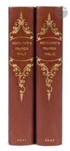 MOORCROFT (William) - TREBECK (George). Travels in the Himalayan provinces of Hindustan and the Panjab ; in Ladakh and Kashmir ; in Peshawar, Kabul, Kunduz, and Bokhara. Londres : John Murray, 1841. — 2 volumes in-8, 218 x 138 : frontispice, lvi, 459 pp., 1 carte ; frontispice, viii, 508 pp., 12 pp. de cat. Demi-chagrin havane, plats sur lesquels ont été collés les plats en percaline d’origine, dos lisse orné, non rogné (reliure moderne). Édition originale rare. « William Moorcroft (1767-1825) était un vétérinaire qui, après avoir exercé un certain temps à Londres, fut engagé en 1807 par la Compagnie des Indes orientales pour gérer son élevage de chevaux. Il arriva en Inde en 1808 et prit en charge les opérations d’élevage de la compagnie à Pusa, au Bengale. En 1811 et 1812, il entreprit des voyages vers le nord-ouest à la recherche de chevaux reproducteurs plus grands et meilleurs que ceux qu’il avait pu trouver en Inde. En juillet 1812, il traversa l’Himalaya pour devenir l’un des premiers Européens à entrer au Tibet par cette route. À cette époque, ses intérêts s’étaient étendus de l’approvisionnement en chevaux à l’ouverture de relations commerciales entre l’Asie centrale et la Grande-Bretagne et à la projection de l’influence britannique au-delà du nord-ouest de l’Inde britannique pour contrer ce qu’il considérait comme une présence russe croissante dans la région. En mai 1819, Moorcroft reçut de la Compagnie des Indes orientales l’autorisation de se rendre à Boukhara (dans l’actuel Ouzbékistan). Il atteignit la ville en février 1825 après un voyage de plus de cinq ans qui le conduisit au Ladakh, au Cachemire, à Rawalpindi, à Peshawar, en Afghanistan via le col de Khyber, et via Kaboul et Kunduz jusqu’à sa destination finale. Il commença son voyage de retour en Inde en juillet 1825, mais mourut de fièvre à Balkh, en Afghanistan, le 27 août. Travels in the Himalayan Provinces of Hindustan and the Panjab est le récit de Moorcroft de son voyage de 1819 à 1825. Il fut édité et publié à titre posthume par Horace Wilson, professeur de sanskrit à l’université d’Oxford et membre de la Royal Asiatic Society, à partir des volumineux carnets et de la correspondance de Moorcroft. Le premier volume est entièrement consacré au voyage et à la résidence de Moorcroft au Ladakh. Le deuxième volume complète le récit du séjour de Moorcroft au Ladakh et relate son voyage au Cachemire, à Kaboul et à Boukhara » (site Library of Congress). L’édition est illustrée de deux belles lithographies en frontispice d’après les dessins de George Trebeck, un jeune Anglais qui accompagna Moorcroft dans son voyage et qui nota des détails géographiques mesurés en pas combinés à des relèvements au compas, et d’une carte dépliante de l’Asie centrale compilée et dessinée par le cartographe londonien John Arrowsmith, basée principalement sur les notes de terrain de George Trebeck. Exemplaire en reliure moderne, sur les plats de laquelle ont été collés les plats d’origine en percaline. Il est complet du catalogue de l’éditeur à la fin du second volume. Dos très légèrement passés. Quelques rares rousseurs, taches rousses dans la marge intérieure du frontispice du premier volume et mouillure dans un angle du frontispice du second volume. Déchirures sans manque à certaines pliures de la carte dépliante. Provenance : Cachet de la Royal Institute of Great Britain sur les titres.