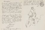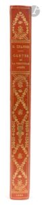 UZANNE (Octave). L’École des Faunes. Fantaisies muliéresques. Contes De la Vingtième Année. Bric à Brac de l’Amour. Calendrier de Vénus. Surprises du Cœur. Paris : Librairie contemporaine H. Floury, 1896. — Grand in-8, 266 x 177 : frontispice, VIII, 300 pp., (2 ff.), couverture imprimée. Demi-maroquin orange à coins, filets dorés, dos lisse orné, tête dorée, non rogné, couverture et dos conservés (Bretault). Première édition collective, tirée à 700 exemplaires, réunissant Bric à Brac de l’Amour, Calendrier de Vénus et Surprises du Cœur, trois textes d’Octave Uzanne parus respectivement en 1879, 1880 et 1881. Elle débute par une introduction inédite de l’auteur. L’illustration se compose d’un frontispice de Daniel Vierge, gravé à l’eau-forte par Frédéric Massé, et de très beaux bandeaux et culs-de-lampe en camaïeu d’Eugène Courboin. Un des 660 exemplaires sur vélin satin d’Écosse, complet du premier plat de la couverture non retenue illustrée par Simonaire, tiré sur papier de Chine. L’exemplaire est en plus enrichi sur le faux titre de deux dessins originaux d’Eugène Courboin, le premier à l’encre de Chine figurant Pierrot et Arlequin recevant des friandises d’une jeune femme, signé et daté de 1895 (l’ouvrage fut achevé d’imprimer le 19 août 1895), le second représentant un portrait de profil et en couleurs d’Octave Uzanne, accompagné de la signature autographe de ce dernier. On y trouve également une belle lettre autographe signée d’Eugène Courboin, 2 pages in-12, non datée, adressée à un « Monsieur ». Il est question d’aquarelles de Bilitis : « Le sujet que j’ai traité dans “Bilitis” était des plus scabreux. Cependant je n’ai pas fait œuvre pornographique. La pornographie est faite de bêtise et de grossièreté. Cela n’est pas le cas de mon aquarelle. C’est libre, c’est certain, mais j’ai été, je crois, l’interprète exact du texte ; ce qui doit toujours être. » En post scriptum il informe son correspondant qu’il fait « beaucoup de bicyclette et peu de travail », et s’est représenté en train de faire du vélo. Bel exemplaire en reliure de Bretault. Taches sur les plats, épidermures aux coins. Rousseurs sur la couverture de Simonaire et quelques-unes sur le faux titre.