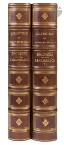 BODE (Wilhelm). Collection of J. Pierpont Morgan. Bronzes of the Renaissance and subsequent periods. Paris : Librairie centrale des Beaux-arts, 1910. — 2 volumes in-folio, 498 x 386 : (2 ff.), XLII, 30 pp., 73 planches ; (2 ff.), 45 pp., 90 planches. Demi-maroquin brun foncé à coins, filets dorés, dos à nerfs orné, tête dorée, non rogné (Petitot). Édition monumentale rare et de grand luxe, tirée à 150 exemplaires, répertoriant les bronzes anciens de la collection du grand amateur américain John Pierpont Morgan (1837-1913). L’ouvrage est présenté et les objets sont décrits par l’historien d’art allemand Wilhelm von Bode (1845-1929), directeur général du musée royal de Berlin. Ouvrage de référence, il fut imprimé par l’imprimerie nationale et rédigé en anglais. Il comprend de nombreuses reproductions photographiques dans le texte ainsi que 163 planches sous serpentes légendées. Très bel exemplaire relié par Petitot et entièrement monté sur onglets. Dos légèrement passés, coins un peu émoussés. Parfait état intérieur.