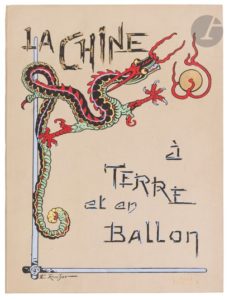[CHINE]. La Chine à Terre et en Ballon. Paris : Berger-Levrault & Cie, 1902. — In-4, 328 x 248 : 15 pp., 42 planches, couverture illustrée. En feuilles, sous chemise de toile beige illustrée en couleurs et à rabats. Album donnant la reproduction de 272 photographies exécutées par des officiers du corps expéditionnaire français lors de la campagne de Chine de 1900-1901, réparties sur 41 planches en phototypie avec légendes explicatives. Composition en couleurs d’Edmond Rocher sur le cartonnage et beaux encadrements sur la couverture et sur les planches par le même artiste. Un des très rares 25 exemplaires du tirage de luxe, celui-ci étant l’un des 20 sur papier Wathman (n° 17). Exemplaire bien conservé malgré une déchirure de 5 centimètres à la charnière du premier plat de la chemise et des brunissures au bord des feuillets.