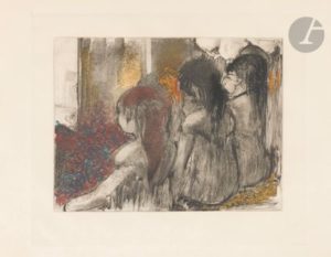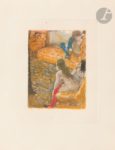 LOUŸS (Pierre) - DEGAS (Edgar). Mimes des courtisanes de Lucien. Paris : Ambroise Vollard, 1935. —In-4, 328 x 254 : (3 ff. premier blanc), IX, 83 pp., (10 ff. 3 derniers blancs), 22 planches, couverture imprimée. En feuilles, couverture rempliée, chemise à dos plats et bandes de parchemin blanc, étui. Édition tirée à 325 exemplaires numérotés sur vélin de Rives, illustrée de 22 gravures de reproduction sur cuivre hors texte, dont 3 en couleurs sur japon, exécutées par Maurice Potin d’après les compositions originales d’Edgar DEGAS, ainsi que de 12 reproductions de dessins du même artiste dans le texte. Un des 305 exemplaires numérotés en chiffres arabes. Rousseurs, affectant surtout la chemise contenant la suite ainsi que les premiers feuillets du livre. Provenance : N. Harwich, avec ex-libris.