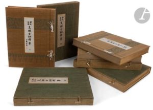 UMEHARA (Sueji). Shina-Kodo Seikwa or selected relics of ancient chinese bronzes from collections in Europe and America. Osaka : Yamanaka & co, 1933. — 3 parties en 7 volumes in-folio, 387 x 304. Reliure à la japonaise en toile verte imprimée, pièce de soie imprimée en japonais sur le premier plat, tranches dorées, chemise à rabats de toile verte. Édition originale de cet ouvrage monumental bilingue, japonais et anglais, proposant une sélection de bronzes chinois provenant des collections d’Europe et d’Amérique. Établi par l’archéologue japonais Umehara Sueji (1893-1983), il est divisé en 3 parties, portant respectivement sur les vases en bronze (vol. I à III), les miroirs anciens (vol. 4 et 5), et les objets divers (vol. 6 et 7). Il réunit la description et la reproduction de plusieurs centaines de bronzes réparties sur 547 planches (250 dans la première partie, 160 dans la seconde et 137 dans la troisième), chacune accompagnée d’une serpente légendée en japonais et en anglais, parfois comprenant également des frottis d’éléments décoratifs de l’objet reproduit. Sueji entreprit ce travail à la faveur d’un séjour de 3 ans en Europe et aux États-Unis de 1926 à 1929. Exemplaire très bien conservé, numéroté dans le premier volume (n° 229). Ce même volume contient une carte collée à la doublure portant l’indication imprimée « With Best Compliments from » suivie de la signature autographe de l’éditeur Sadajiro Yamanaka (1866-1936). En tête de cette carte a été ajoutée la mention tapée à la machine « Musée Guimet, Paris ». Il semble que cet exemplaire, destiné visiblement à ce musée, n’ait jamais été livré à son destinataire. Aucune marque de collection ou de bibliothèque ne figure dans les volumes. Dos des chemises passés. Les ouvrages sont dans un très bon état de conservation, condition des plus rares pour ce livre que l’on trouve souvent incomplet et en mauvais état.