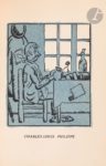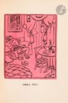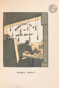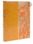 BOFA (Gus). Synthèses littéraires et extra littéraires présentées par Roland Dorgelès. Paris : Éditions Mornay, 1923. — In-8, 188 x 138 : 22 pp., (43 ff.), couverture illustrée. Demi-maroquin citron, filet gras doré vertical sur les plats, dos à deux nerfs ornés de quatre filets dorés, tête dorée, non rogné, couverture et dos conservés (Creuzevault). Édition originale de ce recueil de 40 compositions en couleurs de Gus BOFA (1883-1968), composées avec une grande originalité et avec une grande inventivité. L’artiste réussit en une image à donner une synthèse de l’œuvre de l’écrivain représenté : « L’auteur résume dans un dessin l’impression d’ensemble qu’une œuvre nous a laissée, il parvient à donner une apparence à ce qui n’était en nous qu’un sentiment confus ; plus exactement encore : il cherche à susciter, par un procédé différent, le dessin, une émotion identique à celle procurée par le livre » (p. 18). Cet ouvrage est le quatrième de « La Collection originale » ; il fut tiré à 1317 exemplaires. Celui-ci est l’un des 1161 sur papier vergé blanc, joliment et sobrement relié par Creuzevault. Petite auréole sur le bord du premier plat, débordant légèrement sur le dos. Provenance : Colette Creuzevault.