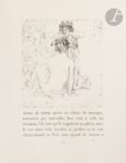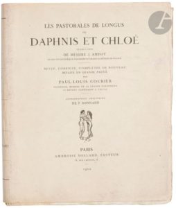 BONNARD (Pierre) - LONGUS. Les Pastorales de Longus ou Daphnis et Chloé Traduction de messire J. Amyot en son vivant évêque d’Auxerre et grand aumônier de France. Revue, corrigée, complétée de nouveau, refaite en grande partie par Paul-Louis Courier, vigneron, membre de la Légion d’honneur ci-devant canonnier à cheval. Paris : Ambroise Vollard, 1902. — In-4, 300 x 247 : (1 f. blanc), X, 294 pp., (3 ff. dernier blanc), couverture illustrée. En feuilles, étui. Édition de luxe publiée par Ambroise Vollard, illustrée de 155 lithographies en gris de Pierre BONNARD (1867-1947) imprimées par Auguste Clot. Tirage limité à 250 exemplaires, celui-ci est l’un des 200 sur Hollande à la forme avec le filigrane « Daphnis et Chloé ». Salissures à la couverture. Rousseurs. Sans la chemise.
