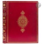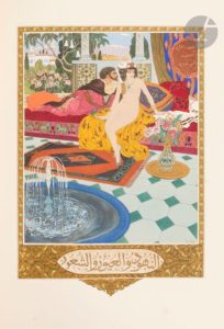 CARRÉ (Louis) - TOUSSAINT (Franz). Le Jardin des caresses. Traduit de l’arabe. Paris : H. Piazza, [1914]. —In-4, 300 x 230 : 84 pp., (2 ff.), 20 planches, couverture illustrée. Maroquin rouge, triple filet doré en encadrement et plaque orientale dorée au centre sur les plats, dos à nerfs orné, quintuple filet doré en encadrement à l’intérieur, tête dorée, non rogné, couverture conservée, étui bordé (Durvand). Édition illustrée de très nombreuses bordures, arabesques et lettrines imprimées en couleurs et à l’or, ainsi que de 20 très belles planches composées d’après Léon CARRÉ (1878-1942), coloriées et dorées au pochoir sous serpente légendée. Tirage limité à 500 exemplaires numérotés. Celui-ci fait partie de ceux tirés en plus du tirage numéroté, imprimé sur papier vélin à la cuve pour Franz Toussaint. Très bel exemplaire en reliure de l’époque de Lucien Durvand, enrichi du spécimen d’une page de texte et d’une illustration avec sa serpente légendée. Petites traces noires sur les plats. Quelques très rares rousseurs. Traces laissées par le signet page 41. Provenance : Franz Toussaint.