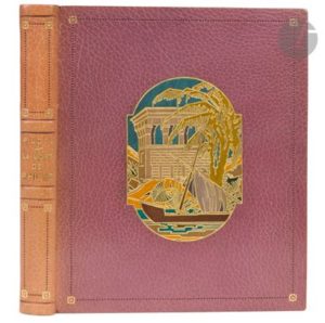 COLUCCI (Gio) - LOTI (Pierre). La Mort de Philæ. Paris : Éditions René Kieffer, 1924. — In-4, 270 x 218 : frontispice, (2 ff.), 163 pp., (3 ff. dernier blanc), 19 planches, couverture imprimée. Maroquin lilas, roulettes de points à froid jointes aux angles par un fleuron doré en encadrement et plaque dorée et mosaïquée représentant un décor oriental au centre sur les plats, dos à nerfs orné, roulette et fer dorés à l’intérieur, tête dorée, non rogné, couverture et dos conservés, étui (René Kieffer). Édition tirée à 500 exemplaires, illustrée de 22 eaux-fortes originales du peintre et illustrateur Gio COLUCCI (1892-1974), dont une sur le titre et 21 hors texte (le titre en annonce 20). UN DES 20 PREMIERS EXEMPLAIRES SUR JAPON IMPÉRIAL, comprenant trois états des eaux-fortes, celui-ci portant le numéro 1. Très bel exemplaire relié par René Kieffer. Dos passé.