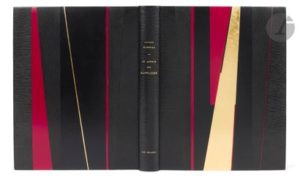 COLUCCI (Gio) - MIRBEAU (Octave). Le Jardin des supplices. Paris : La Connaissance, 1925. — In-4, 327 x 247 : frontispice, (6 ff. 3 premiers blancs), XVIII pp., (1 f.), 210 pp., (5 ff. 3 derniers blancs), 13 planches, couverture illustrée. Peau de chèvre à long grain noire, composition de bandes verticales de chèvre noire, de box rouge, de box noir et de box noir doré à la feuille sur les plats, dos lisse, doublures bord à bord de box noir, gardes de daim bordeaux, tête dorée, non rogné, couverture et dos conservés, étui bordé (Anick Butré 1998). Édition rare ornée par le peintre et illustrateur Gio COLUCCI (1892-1974) de 60 compositions, dont 2 en vert pâle sur la couverture et 58 coloriées au pochoir sur le titre, en tête de chapitre, en lettrines et en culs-de-lampe, ainsi que de 14 planches, dont une en frontispice, gravées à l’eau-forte et rehaussées en couleurs au pinceau. Tirage à seulement 103 exemplaires ; celui-ci est l’un des 102 sur vélin pur fil Montgolfier, enrichis d’une suite en noir des illustrations du livre. Précieux exemplaire relié par Anick Butré, enrichi des deux compositions en couleurs de Dyl que l’on trouve originellement sur la chemise de l’éditeur. La suite, en feuilles et sous couverture rempliée, a été placée dans une chemise souple faite des mêmes matières que la reliure, avec un décor dans le même esprit mais différent. Exemplaire très bien conservé.