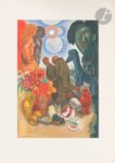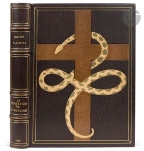 DARAGNÈS (Jean Gabriel) - FLAUBERT (Gustave). La Tentation de St Antoine. Avec une introduction de Paul Valéry. Paris : chez l’artiste, 1942. — In-4, 309 x 226 : XXIV pp., (2 ff.), 221 pp., (3 ff. 2 derniers blancs), couverture illustrée. Maroquin marron foncé, double filet doré en encadrement sur les plats, premier plat orné d’une grande croix mosaïquée de maroquin havane, autour de laquelle est enroulé un serpent de maroquin beige et gris-vert, dos à nerfs orné de filets dorés en encadrement, maroquin marron foncé en encadrement à l’intérieur, orné de quatre filets dorés se croisant aux angles formant un motif de 9 petits carrés, les quatre aux coins entièrement dorés, doublures et gardes de soie moirée grise, tranches dorées sur témoins, couverture et dos conservés, étui (E. & A. Maylander). Belle édition imprimée et illustrée par Jean Gabriel DARAGNÈS (1886-1950), comprenant 24 bois originaux en couleurs dont un en frontispice et 9 à pleine page. Tirage à 1480 exemplaires sur papier vélin de Rives (n° 792). Superbe exemplaire en reliure mosaïquée d’Émile et André Maylander. Il est enrichi d’une grande aquarelle originale à pleine page signée de Daragnès. Exemplaire parfaitement conservé malgré le dos très légèrement éclairci.