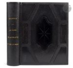 DECARIS (Albert) - BARRÈS (Maurice). Du sang de la volupté et de la mort. Paris : Éditions du bois sacré, [1930]. — In-4, 326 x 245 : 318 pp., (2 ff.), couverture illustrée. Maroquin noir, plats ornés de compartiments en léger relief en encadrement et au centre, avec une rose des vents modelée au centre du premier plat, dos lisse, maroquin noir en encadrement à l’intérieur, orné de filets à froid, doublures et gardes de soie rouge, tranches dorées sur témoins, couverture et dos conservés, chemise à dos et bandes à rabats de maroquin noir, étui bordé (Creuzevault). Belle édition tirée à 316 exemplaires, illustrée de 93 gravures originales d’Albert DECARIS (1901-1988), dont 37 à pleine page. Un des 216 exemplaires sur papier vergé blanc de Hollande Van Gelder. Revêtu d’une très belle reliure de Creuzevault, il a été enrichi du prospectus de parution et d’un très beau dessin original signé de l’artiste au lavis au format du livre, non reproduit dans l’édition. Exemplaire parfaitement conservé. Transfert de certaines gravures.