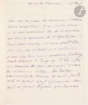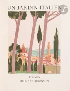 DENIS (Maurice) - ROBINSON (Mary). Un Jardin italien. Paris, 1931. — In-4, 285 x 265 : (6 ff. 3 premiers blancs), 66 pp., (2 ff. blancs), couverture illustrée. Parchemin blanc, filets et roulette dorés en encadrement sur les plats, fleuron doré aux angles, écusson doré au centre du premier plat, dos lisse orné, doublures et gardes de soie bleue, tête dorée, non rogné, couverture et dos conservés (Yseux sr de Thierry-Simier). Première édition de ce recueil de poèmes, en anglais et français, de Mary Robinson (1857-1944), illustrée de 25 compositions de Maurice DENIS (1870-1943), dont une sur la couverture, 12 dans le texte dont une répétée sur le titre, et 11 à pleine page, gravées sur bois par les frères Beltrand. Tirage unique à 225 exemplaires imprimés sur papier vélin BFK de Rives par l’imprimerie nationale. Précieux exemplaire provenant de la collection du comte René Philipon (1869-1936), enrichi de 1 à 4 tirages d’états supplémentaires des illustrations, mais également des pièces suivantes : - une carte de visite de Maurice Denis en partie autographe, accompagnée de son enveloppe à l’adresse de René Philipon, - une lettre autographe signée de Jacques Beltrand, adressée à René Philipon, 1 page in-4, datée du 29 novembre 1931, enveloppe jointe, - deux lettres autographes de l’autrice, signées « Mary Duclaux », 1 page in-8 carré et 2 pages in-4, à propos d’épreuves. - Tirage d’essai des 8 premières pages, relié à la fin. Très bel exemplaire relié à l’époque par Yseux, très bien conservé. Provenance : René Philipon, avec écusson du château de Vertcœur sur le premier plat. - Philos Montoy, avec ex-libris gravé par Andrada.