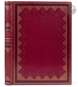 DROUART (Raphaël) - HEINE (Henri). Intermezzo lyrique. Paris : Henry Babou, [1931]. — Grand in-4, 348 x 245 : 119 pp., (4 ff.), couverture imprimée. Maroquin bordeaux, large encadrement sur les plats, composé d’un filet doré, d’un filet gras à froid et à l’intérieur de pyramides de 7 filets dorés surmontées de demi-cercles à froid, dos à un large nerf orné dans le même esprit, filet à froid et trois filets dorés en encadrement à l’intérieur, doublures et gardes de soie argent, doubles gardes, tête dorée, non rogné, couverture et dos conservés, étui bordé (Yseux Sr de Simier). Édition tirée à 137 exemplaires, illustrée de 12 eaux-fortes originales à pleine page du peintre et illustrateur Raphaël DROUART (1884-1972). Précieux exemplaire, non numéroté, spécialement imprimé pour l’artiste. Il est, comme les 12 de têtes, réimposé sur japon blanc nacré et enrichi de deux suites des gravures, avec remarques sur papier de Chine blanc contrecollé sur Hollande teinté, et en bistre sur japon blanc nacré. Comme il vient en plus des 12 de têtes, il ne comporte pas de cuivre original. Très bel exemplaire relié à l’époque par Yseux. Dos légèrement passé. Quelques rares piqûres sans gravité. Provenance : Raphaël Drouart.