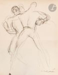 DUNOYER DE SEGONZAC (André) - BERNARD (Tristan). Tableau de la boxe. Paris : Nouvelle Revue Française, [1922]. — Grand in-8, 236 x 189 : 212 pp. (4 ff. dernier blanc), couverture imprimée. Maroquin noir, premier plat orné d’un décor représentant un ring de boxe, composé d’une grande pièce de box gris, de listels de maroquins gris clair et noirs, de filets à froid et, pour symboliser les lumières, deux pièces de box noir bordées de deux filets couleur argent, surmontant des filets obliques à froid s’entrecroisant, dos lisse, encadrement de maroquin noir à l’intérieur, doublures et gardes de daim gris, tranches au palladium sur témoins, couverture et dos conservés, chemise à rabats à dos de maroquin noir, étui bordé (Creuzevault). Lioret et Cailler, I, N° 38 à 66. Édition recherchée, illustrée de 29 eaux-fortes originales d’André DUNOYER DE SEGONZAC (1884-1974), dont 9 à pleine page. Il s’agit du second livre de la collection des « Tableaux contemporains », le plus recherché de la série. Il a été tiré à 333 exemplaires, celui-ci étant l’un des 318 sur vélin pur fil (n° 49). Très bel exemplaire en reliure de Creuzevault qui a reproduit un ring de boxe sur le premier plat. Il est enrichi du dessin sur papier calque du décor de la reliure, et d’un dessin original signé de Dunoyer de Segonzac, représentant deux boxeurs, non reproduit dans l’ouvrage. Exemplaire très bien conservé malgré le dos de la chemise passé. Provenance : Colette Creuzevault.
