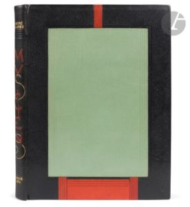 JOU (Louis) - SUARÈS (André). Musiciens. [Paris : Louis Jou, 1931]. — In-4, 277 x 210 : (5 ff. deux premiers blancs), 98 pp., (4 ff.), couverture illustrée. Maroquin noir, plats ornés d’un grand rectangle central de box vert d’eau orné de quatre filets à froid, et bordé en haut et en bas de pièces rectangulaires de maroquin orange, dos lisse orné du nom de l’auteur et de l’artiste en lettres dorées, et du titre en long doré et mosaïqué de maroquin rouge, doublures et gardes de papier noir décoré, tête dorée, non rogné, couverture et dos conservés, étui bordé (M. R. Labussière). Édition illustrée d’une couverture, de 3 frontispices et de 4 portraits à pleine page en plusieurs couleurs (Beethoven, Achille, Baudelaire et Franz Liszt), ainsi que de près de 100 lettrines, bandeaux, culs-de-lampe et en-têtes, le tout gravé sur bois par Louis JOU (1882-1968) qui a également assuré l’impression avec ses propres caractères. Tirage limité à 210 exemplaires, celui-ci étant l’un des 125 sur papier vergé à la forme des papeteries d’Arches, enrichi du prospectus de parution. Très bel exemplaire relié par Labussière.