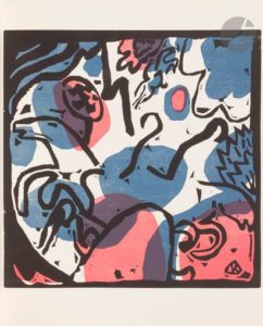 KANDINSKY (Vassily). Du Spirituel dans l’art et dans la peinture en particulier. Paris : Galerie René Drouin, [1949]. — In-4, 282 x 225 : (2 ff. blancs), 121 pp., (3 ff. deux derniers blancs), couverture imprimée. Broché, couverture rempliée, chemise, étui. Nouvelle édition du premier grand livre théorique sur l’art de Vassily Kandinsky (1866-1944), paru pour la première fois en 1911. Tirage limité à 300 exemplaires numérotés sur papier Lana à la forme, contenant UN BOIS ORIGINAL EN COULEURS DE KANDINSKY et 8 reproductions de tableaux en noir à pleine page. Bords de l’étui passés. Quelques cahiers décalés.