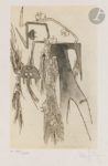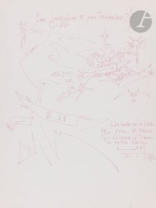 LAM (Wifredo). Wifredo Lam. [Paris] : Denoël, [1970]. — Grand in-4, 409 x 305 : (4 ff. premier blanc), 112 pp., (4 ff.). En feuilles, sous chemise rigide et étui en toile de l’éditeur. Édition originale de cet ouvrage préfacé par Yvon Taillandier et illustré de très nombreuses reproductions en noir et en couleurs d’œuvres de l’artiste. UN DES 135 EXEMPLAIRES ACCOMPAGNÉS D’UNE EAU-FORTE ORIGINALE NUMÉROTÉE ET SIGNÉE PAR WIFREDO LAM, celui-ci faisant partie des 35 hors commerce. L’eau-forte est sur japon nacré. PRÉCIEUX EXEMPLAIRE DU PRÉFACIER YVON TAILLANDIER, comprenant sur la première garde blanche, cette belle dédicace autographe signée de Wifredo Lam, autour d’un grand et beau dessin original de l’artiste, le tout à l’encre rouge : Pour Jacqueline et Yvon Taillandier // à la santé de ce livre // 50/100 Yvon-Wifredo, // qui restera le témoin // de notre amitié // Lam // 10 - 1 1971 Taillandier l’offrit par la suite à un de ses amis éditeur, et l’enrichit d’un second double feuillet avec le faux titre de la préface, qu’il a entièrement recouvert sur deux pages d’une très belle gouache originale signée, dédicacée et datée de 2005. Exemplaire très bien conservé. Provenance : Jacqueline et Yvon Taillandier, avec envoi et dessin de Wifredo Lam. - Envoi et gouache d’Yvon Taillandier à un ami éditeur.