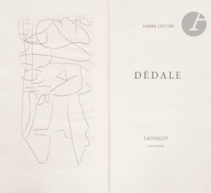 LANSKOY (André) - LECUIRE (Pierre). Dédale. S.l. : [Pierre Lecuire, 1960]. — In-4, 325 x 179 : (1 f. blanc), 102 pp., (6 ff. dernier blanc), couverture imprimée. En feuilles, chemise en peau de mouton couleur sable illustrée d’une gravure sur le premier plat, emboîtage à rabats de l’éditeur, en carton brun avec lacets en cuir. Livres de Pierre Lecuire, Bibliographie descriptive, 1980, n° 7. - Les livres de Pierre Lecuire, BnF, 2001, n° 32. Édition originale de ce recueil de poèmes de Pierre Lecuire, illustrée de 22 eaux-fortes originales du peintre d’origine russe André LANSKOY (1902-1976), dont une sur la chemise en cuir et 21 à pleine page. Une note imprimée en regard de la justification à la fin, précise que « les eaux-fortes originales que Lanskoy a gravées pour Dédale sont ses premières gravures ». Tirage limité à 190 exemplaires sur papier d’Auvergne à la main du moulin Richard-de-Bas, signés par l’auteur et l’artiste à la justification, celui-ci étant l’un des 145 numérotés de 26 à 170 (n° 81). EXEMPLAIRE EXCEPTIONNELLEMENT ENRICHI D’UNE DES 25 SUITES DES GRAVURES SUR PAPIER DE CHINE, normalement destinées aux 25 exemplaires de tête, conservée dans une chemise en peau de mouton sable. Fente de quelques centimètres à une charnière de l’emboîtage et quelques auréoles claires sur le premier plat. Petite mouillure claire sans gravité sur un bord de la suite sur chine. Décharge, comme toujours, du rabat de la chemise.