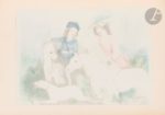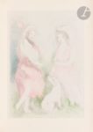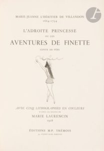 LAURENCIN (Marie) - L’HÉRITIER DE VILLANDON (Marie-Jeanne). L’Adroite princesse ou les aventures de Finette, conte de fées. Paris : Éditions M.-P. Trémois, 1928. — In-folio, 452 x 317 : (1 f. blanc), 30 pp., (5 ff. 2 derniers blancs), couverture imprimée. En feuilles, couverture rempliée, chemise et étui de l’éditeur. Très belle édition tirée à 480 exemplaires, illustrée d’une vignette en noir sur le titre, reprise sur la couverture, et de 5 grandes lithographies en couleurs sur chine monté de Marie LAURENCIN (1883-1956), comprises dans la pagination. Un des 450 exemplaires sur papier vélin, enrichi de la couverture du Crapouillot de Noël 1928, illustrée d’une composition de Marie Laurencin. Légères usures au dos de la chemise. Rousseurs claires et quelques déchirures restaurées à la couverture. Parfait état intérieur, les rabats de la couverture ayant comme toujours bruni le feuillet en regard. Provenance : N. Harwich, avec ex-libris.