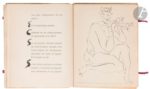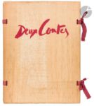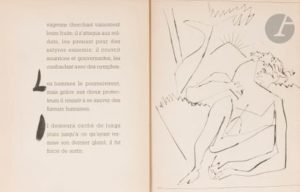 PICASSO (Pablo) - REVENTOS (Ramon). Deux Contes. Le Centaure Picador. Le Crépuscule d’un faune. Paris, Barcelone : Éditions Albor, 1947. — In-4, 332 x 255 : (34 ff. 2 premiers et 2 derniers blancs), couverture imprimée. En feuilles, couverture rempliée, sous portefeuille en bois comprenant le titre en rouge sur le premier plat, et avec rubans d’attache en tissus rouge. Goeppert & Cramer, nº 45 Édition originale de la traduction française faite par Jaume Canyameres des deux contes Le Centaure Picador et Le Crépuscule d’un faune de Ramon Reventos. Elle est illustrée de 4 pointes sèches originales à pleine page de Pablo PICASSO (1881-1973). « Encouragé par le succès des « Dos Contes », l’éditeur envisagea une version française. Jaume Canyameres en ferait la traduction, Picasso fournirait quatre autres gravures. En été 1947, le texte était imprimé, mais les gravures manquaient toujours. Picasso ne les grava qu’en février 1948, à Golfe-Juan. Le premier conte […] est illustré de deux pointes sèches représentant le centaure tirant la carriole de son maître et le centaure (picador et cheval à la fois) luttant avec le taureau. Le deuxième conte, […] est illustré de deux pointes sèches représentant le faune jouant de la flûte et la mort du faune. Picasso dessina à la plume la couverture, la page de titre de chaque conte, les lettrines ainsi que, dans le texte, l’affiche annonçant la corrida du centaure picador » (Cramer). Tirage limité à 250 exemplaires sur vélin de Lana, celui-ci faisant partie des 230 numérotés de 21 à 250. Dos de la couverture défait et en grande partie manquant. Plats de couverture fortement roussis comme toujours à cause du bois. Rousseurs éparses. Provenance : N. Harwich, avec ex-libris.