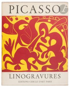 PICASSO (Pablo). Pablo Picasso. Linogravures. Introduction Wilhelm Boeck. Paris : Cercle d’art, [1962]. — In-folio oblong, 319 x 387 : (7 ff.), 45 planches. Toile grise d’édition imprimée en rouge, étui illustré. Superbe ouvrage proposant 45 linogravures de Pablo PICASSO (1881-1973) remarquablement reproduites en couleurs sur papier vélin fort. Exemplaire très bien conservé.
