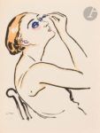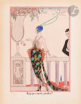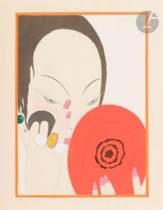 [REVUE]. Feuillets d’art. Paris : Edmond Moussié, Michel Dufet, 1919-1920. — 6 fascicules in-4, 327 x 258. En feuilles, sous chemise à rabats de l’éditeur. Collection complète de la première série de cette luxueuse revue de la période Art déco, dirigée par Michel Dufet et financée par Edmond Moussié. Elle est consacrée à la littérature, au théâtre, aux arts plastiques, aux arts décoratifs, à la musique et à la mode. Ces thématiques sont abordées dans cinq rubriques ou « feuillets », comprenant des textes littéraires parfois inédits ainsi que des textes d’études. Parmi les auteurs figurent Jean Giraudoux, Anatole France, Henri de Régnier, Paul Claudel, Henri Duvernois, Charles Vildrac, Roger Allard, Camille Mauclair, André Salmon, Anna de Noailles, Georges Duhamel, Francis Jammes, Abel Hermant, etc. Chaque numéro comporte une riche illustration en noir et en couleurs, dont plusieurs hors-textes de Georges LEPAPE, George BARBIER, BENITO, Robert BONFILS, André DOMAIN, Charles MARTIN, Odilon REDON, Kees VAN DONGEN, etc. Exemplaire dont chaque fascicule porte le numéro 811, comprenant à chaque fois plusieurs cahiers sur Hollande et certains hors-textes sur différents papiers, la plupart numérotés, à savoir : I. La Femme au miroir rouge de Georges Lepape et Ohe du bâteau de Charles Martin sur japon — II. La Loge de Charles Martin sur japon, Laissez-moi seule de George Barbier et les deux hors-textes de Florès et de Benito sur Hollande. — III. Le Cavalier de Bonfils sur japon, et les deux hors-textes de Romme et de Domin sur Hollande. — IV. Eau-forte de Laboureur sur japon. — V. Le Rimmel de Van Dongen sur japon. — VI. Croquis de Drian sur vergé d’Arches et La Pluie d’or de Mario Simon sur Hollande. Parmi les autres illustrations on peut également relever une eau-forte d’Odilon Redon et de nombreuses publicités dans le plus pur style art déco. La publication connaîtra une deuxième série de 6 volumes parus de septembre 1921 à octobre 1922. Déchirures au dos des chemises, quelques salissures. Premier et dernier feuillets de chaque fascicules brunis par la chemise. Sans les cordonnets noir et rose. Déchirure sans manque au premier feuillet du premier numéro.
