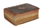 2 livres en un volume fort in-folio, veau marron, double filet à froid et petits fleurons angulaires dorés, grand fleuron central doré à entrelacs et fond azuré sur les plats, sur le premier plat mention dorée Philippes et sur le second Boyssot , dos postérieur à 5 nerfs orné de fleurons dorés avec petite étiquette de bibliothèque en pied, tranches de quatre couleurs différentes, rouge, blanche, jaune et bordeaux ( Reliure de l’époque ).