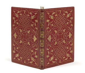 Plaquette in-16, maroquin rouge avec grand décor de style Renaissance aux filets et fers azurés, dos à 5 nerfs orné, doublure de maroquin olive avec grand encadrement droit formé de multiples filets et roulettes dorés, gardes de soie vert olive, tranches dorées, étui ( Brugalla - 1949 ).