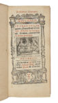 Titre en rouge et noir avec caractères ronds et gothiques et encadrement architectural surmonté des mots Jesus Maria , vignette et marque de François Juste.