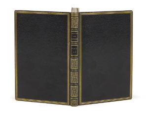 Petit in-8, maroquin bleu nuit, triple filet doré en encadrement, dos à 5 nerfs joliment orné, doublure de maroquin rouge vif avec dentelle droite dorée en encadrement et petits fleurons angulaires, tranches dorées sur marbrure ( Trautz-Bauzonnet ).