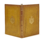 In-folio, maroquin citron, quadruple encadrement de doubles filets droits dorés, armoiries dorées au centre, dos à 5 nerfs joliment orné, roulette intérieure dorée, tranches dorées ( Koehler ).