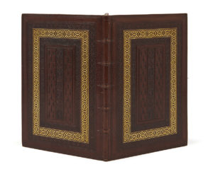 Lyon, par Estiêne Baland Imprimeur de ladicte cite demourant en la grand Rue du Puis Pelu ou lieu, dit Paradis, pour maistre Jan Lemaire, mai 1511. In-4, maroquin brun, plats ornés d’un grand décor formé de multiples encadrements dorés et à froid avec filets et roulettes, fleurs de lys et hermines, au centre des plats bandeau vertical à froid orné de quatre petits portraits en médaillon dans des couronnes de laurier, dos muet à 5 doubles nerfs, gardes de soie brochée rose à motif floral, tranches dorées ( Gruel ).