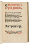 Édition originale imprimée par Nicolas Couteau et parue à Paris chez Galliot Du Pré en 1530, et presqu’immédiatement suivie de deux autres éditions en 1532 chez Longis et Janot. Elle comporte le titre imprimé en rouge et noir, un bois signé d’une croix de Lorraine représentant l’auteur offrant son livre au roi avec des ruches à l’arrière-plan (f. []2v) et la marque de l’imprimeur au verso du colophon (f. ¿5v, Renouard, n° 262). Très bel exemplaire malgré un petit manque en pied d’un feuillet (C1)