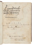 Dos redoré, tache au premier plat. Titre déchiré et doublé avec manques, sali avec annotations manuscrites anciennes, réparations grossières aux feuillets a2, a3, a4 ; mouillures marginales, taches et petite galerie de vers aux 40 premiers feuillets, déchirure dans la marge supérieure des 7 premiers feuillets.