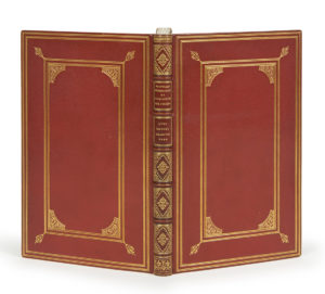 In-8, maroquin rouge orné dans le genre Du Seuil d’un double encadrement de quadruples filets dorés, fers angulaires et écoinçons dorés, dos à 5 nerfs joliment orné, dentelle intérieure, tranches dorées sur marbrure ( Trautz-Bauzonnet ).