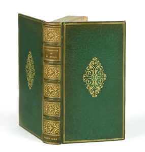 In-12, maroquin vert, double filet doré, fleuron losangé central doré, dos à 5 nerfs orné, roulette intérieure, tranches dorées ( Thompson ).