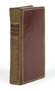 In-12, maroquin rouge, triple filet doré en encadrement, dos lisse orné à la grotesque, roulette intérieure, tranches dorées sur marbrure ( Reliure du XVIIIe siècle ).