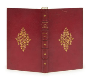 In-8, maroquin rouge avec fleuron losangé central, dos à nerfs orné d’un petit fleuron répété, dentelle intérieure, tranches dorées sur marbrure ( Trautz-Bauzonnet ).