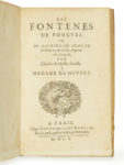 Charles de Massac. Les Fontenes de Pouges de Mre Raimon de Massac Docteur en Medecine, mises en vers françois, par Charles de Massac son fils… Paris, Toussainct Du Bray, 1605. (8f. le premier blanc)-44-(2f. dont un blanc) / ¶8, A-C8(le dernier blanc). Édition originale. 5 feuillets restaurés (titre, premier feuillet blanc, feuillets ¶5, ¶7 et ¶8).