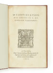 Très rare édition originale, dont on ne connaîtrait que six exemplaires. Si Les Amours , parus en 1552, chantaient la gloire de Cassandre, Ronsard, dans sa Continuation des Amours , change de muse et de style. C’est désormais pour Marie, jeune fille de quinze ou seize ans, probablement moins inaccessible que la noble Cassandre, que le poète compose ses sonnets. Ici, Ronsard renonce aux allusions mythologiques dont il éblouissait Cassandre (Barbier-Mueller) et remet à l’honneur la chanson « marotique » plus tendre et émouvante que ses précédents