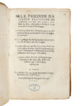 [ LE ROY]. PLATON. Le Phedon de Platon traittant de l’immortalite de l’ame, presenté au Roy treschrestien Henry II. de ce nom, à son retour d’Allemagne. Le dixiesme livre de la Republique… Deux passages du mesme autheur a ce propos, l’un...